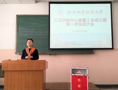 校工会副主席杨瑞静发表讲话,充分肯定了工程训练中心直属工会第一次会员大会筹备工作领导小组前期的工作,并表示,第一次工会会员大会意义重大,必将载入工程训练中心发展历程的史册。她同时指出工会是党领导下的组织,要切实维护全体教职员工的合法权益,要建设成为习近平总书记所要求的“工会组织成为职工群众最可信赖的职工之家、工会干部成为职工群众最可信赖的娘家人”。她还通报了校工会近期工作情况,并对工程训练中心直属工会未来的工作提出了殷切的希望。