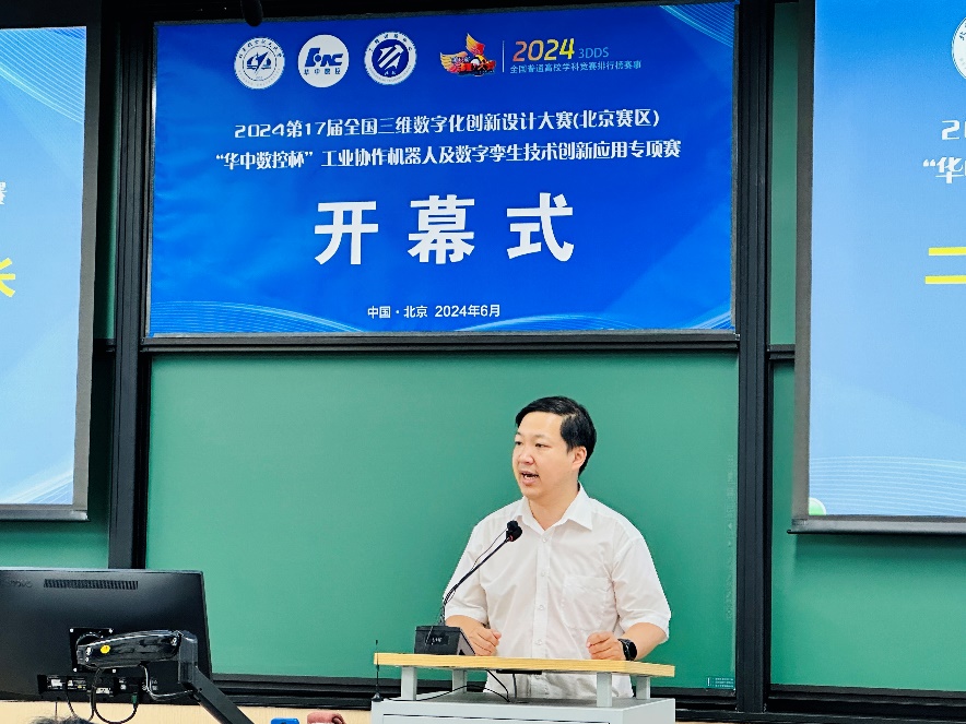 霍有朝副主任宣布2024第17届全国三维数字化创新设计大赛“华中数控杯”工业协作机器人及数字孪生技术创新应用专项赛北京赛区选拔赛正式开赛。