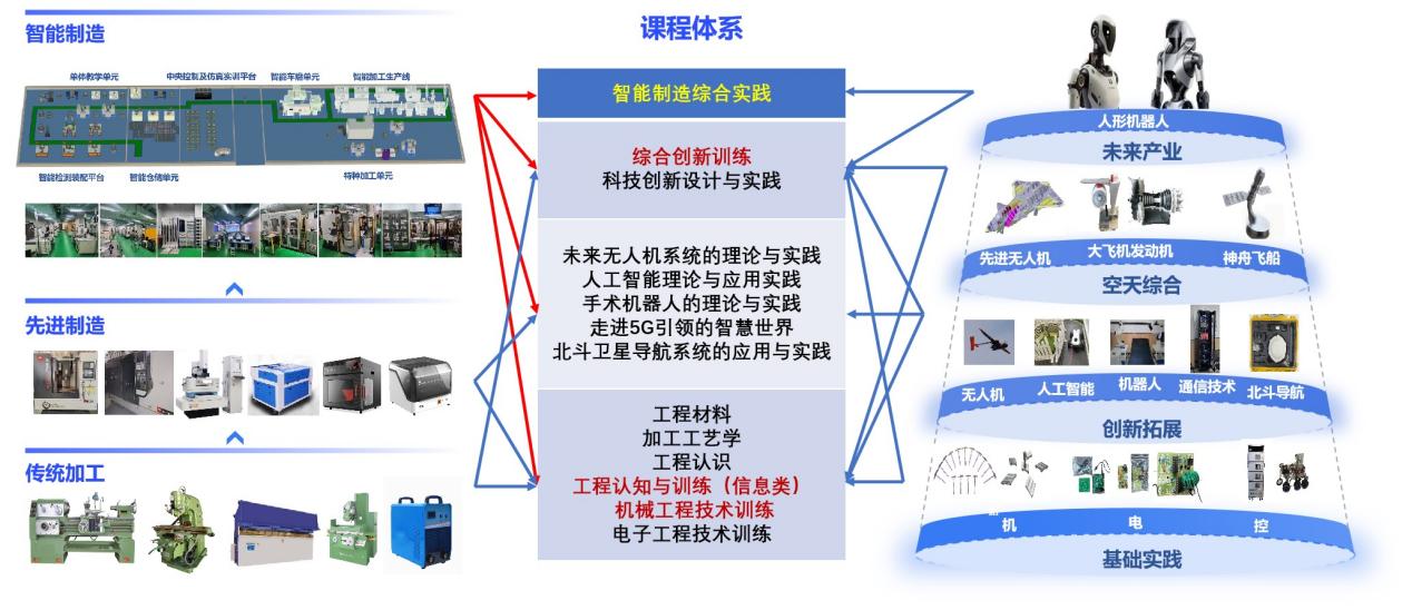 智造工厂将持续深化“工程实践+”教学模式改革,紧密结合航空航天特色,聚焦“人形机器人”等前沿发展领域,与专业学院、领军企业紧密合作,深入推动学科交叉,切实通过实践环节搭建育人场景,重点开发以具身智能机器人协同制造为代表的特色实践模块。通过构建“北航传统+创新智造”相结合的“工程认知-工程实践-前沿拓展-综合创新”四层进阶式课程体系,强化学生解决复杂工程问题的能力,不断探索新时代工程人才培养的新模式。