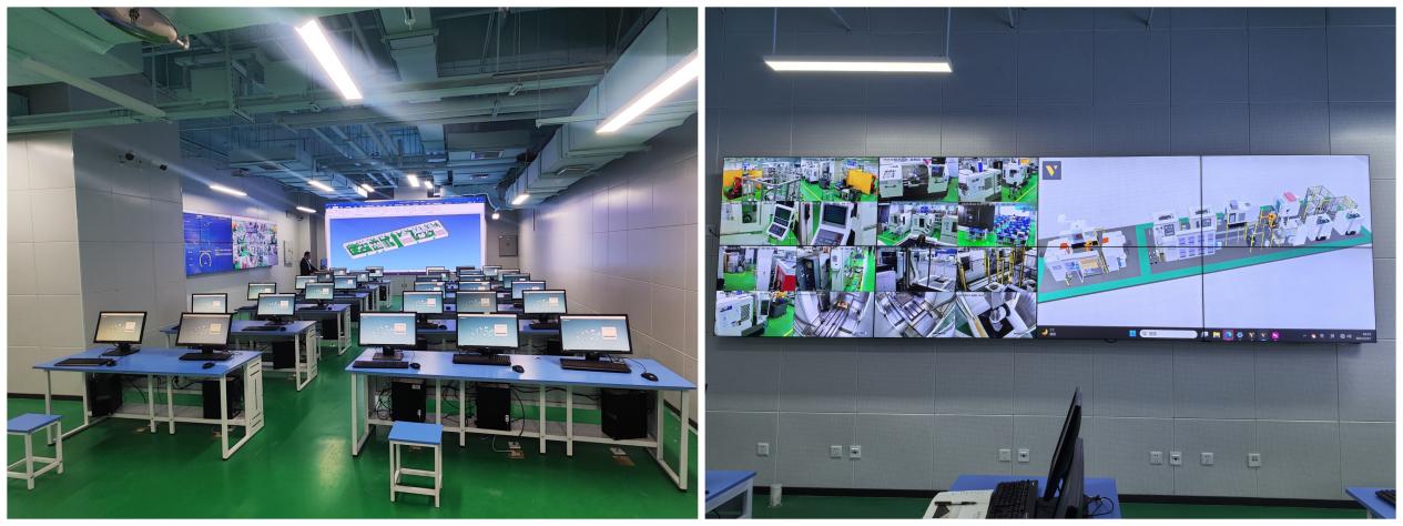 中央控制及仿真实训平台通过数字孪生系统实现虚实联动的教学模式,学生可在虚拟环境中预演加工方案后,于物理产线完成验证优化,并且可对产线运行情况进行实时可视化监督。