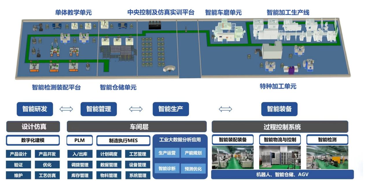 智能加工平台由智能加工生产线、智能车磨单元、智能仓储单元、特种加工单元以及单体教学单元组成。