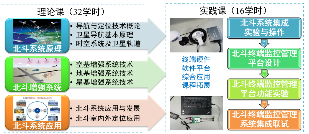 北斗卫星导航系统的应用与实践课程是依托工训中心的北斗创新实验室开设的一般通识课,于2021年获批校级虚拟仿真一流本科课程立项。本课程理论课讲授系统原理、增强系统和系统应用三个部分,同时配合北斗星座仿真模型、北斗卫星模型等为学生详细讲述北斗星座与系统设计和北斗卫星的设计工作,尤其是介绍我国如何突破自主关键核心器件,打造国之重器。