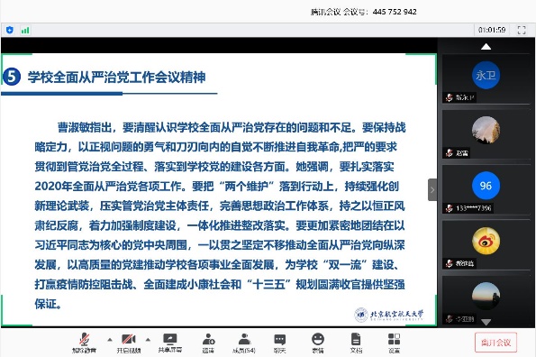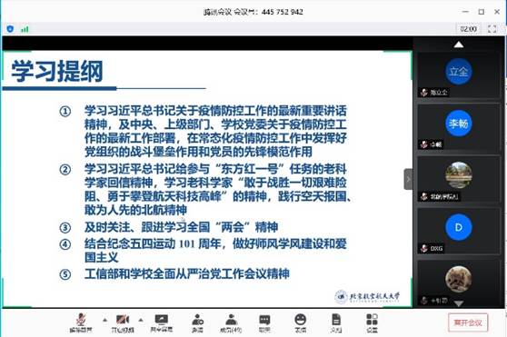 支部组织委员邱玉婷领学了习近平总书记关于疫情防控工作的最新重要讲话精神及中央、上级部门、学校党委关于疫情防控工作的最新工作部署;支部宣传委员李烨领学了习近平总书记给参与“东方红一号”任务的老科学家回信精神;中心副主任兼支部纪检委员韩永鹏领学了政府工作报告要点;齐海涛领学了习近平总书记在纪念五四运动100周年大会上的讲话要点。