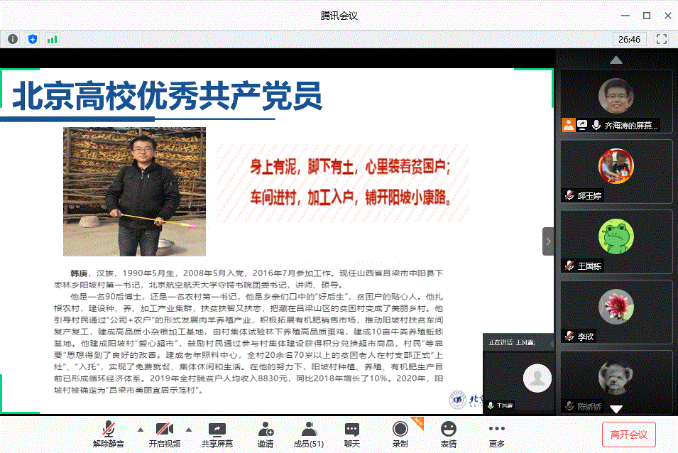 会上,齐海涛宣讲了疫情防控工作的最新工作部署,要求全体教职工严格遵守离京返京政策、注意防护、坚持打卡。随后,支部党员分别进行领学,具体如下:党员孙英蛟领学了习近平总书记给复旦大学青年师生党员的回信精神;党员王凤霞领学了学校纪念中国共产党成立99周年暨“不忘初心、对标争先”党建示范创建工作会会议精神,介绍了两优一先的先进事迹;党员何立新结合中心实际工作领学了教育部印发的《高等学校课程思政建设指导纲要》;党员赵满春领学了《中华人民共和国公职人员政务处分法》。