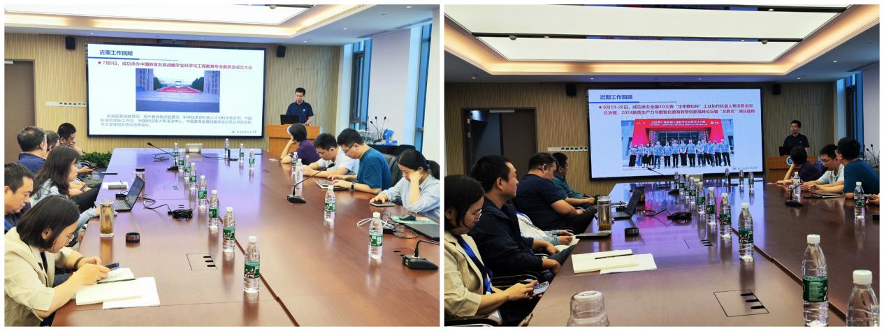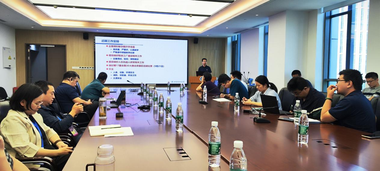 随后,齐海涛副主任对中心暑假期间开展的重点工作进行了全面回顾。他提到,7月9日中心成功承办了中国教育发展战略学会科学与工程教育专业委员会的第一届会员代表大会暨理事会成立大会,这一盛事不仅彰显了中心在业界的影响力,也为推动科学与工程教育的发展贡献了力量。8月18日至20日期间,中心又圆满举办了全国3D大赛“华中数控杯”工业协作机器人及数字孪生技术创新应用专项赛全国总决赛,并同期举行了2024年新质生产力与数智化教育教学创新高峰论坛暨全国3D大赛16周年精英联赛“龙鼎奖”颁奖盛典,这一系列活动不仅为参赛者搭建了展示能力的平台,还深入探讨了新质生产力如何赋能教育教学、推动数智化教育实践的最新趋势与前沿动态,充分展现了北航在新时代教育科技创新中的引领作用和贡献。在暑假期间,中心积极组织师生参与多项全国性赛事,并取得了令人瞩目的优异成绩,这不仅是对师生们辛勤付出与卓越能力的肯定,也是中心教育教学与创新能力的重要体现。